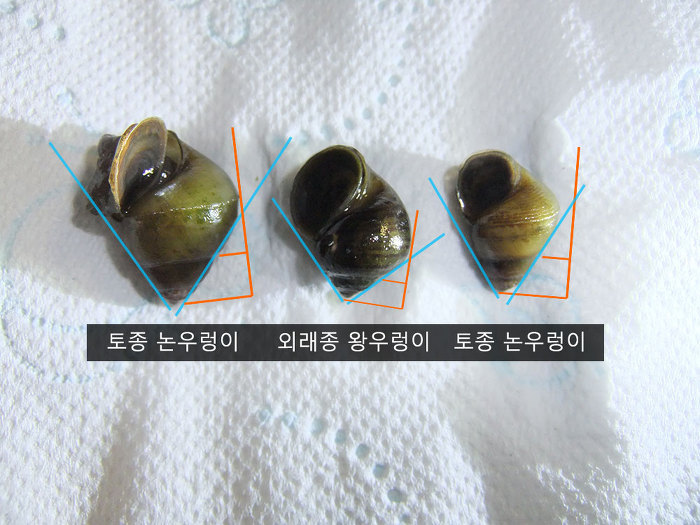 - 외래종 왕우렁이는 급격한 나선형으로 각도가 큽니다. 90도 전후.