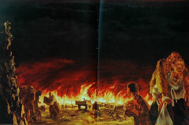 제주 4.3 유적지들을 찾아 제주 산야를 헤매다니기도 하고 마을 촌로들을 찾아가 증언을 청취하면서 뜨거운 눈물을 떨구기도 했다. 제주 온 산야를 적셨던 당시의 피와 눈물을 반 세기 가깝게 지난 오늘에 되살리는 일은 결코 용이한 것이 아니었다. 햇수로 3년 동안의 고투 끝에 강요배는 드디어 50편의 4.3 연작, 그 웅혼한 파노라마를 우리 앞에 펼쳐 보이게 되었다.