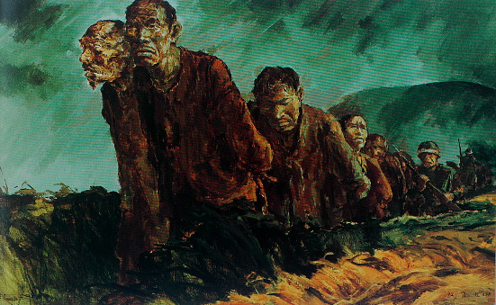 토벌대의 포로 - '미군 철모, 미군복, 미군화, 미군 총, 비가 오면 그 위에 미군우장을 쓴 키 작은 이 나라의 병사들이 종족의 섬멸에 동원되어' '돌보는 이 없이 누렇게 우거진 보리밭이 한 줄기 비에도 썩어 가는데' '광대뼈 불거진 늙은 농민들' 을 끌어갔다.