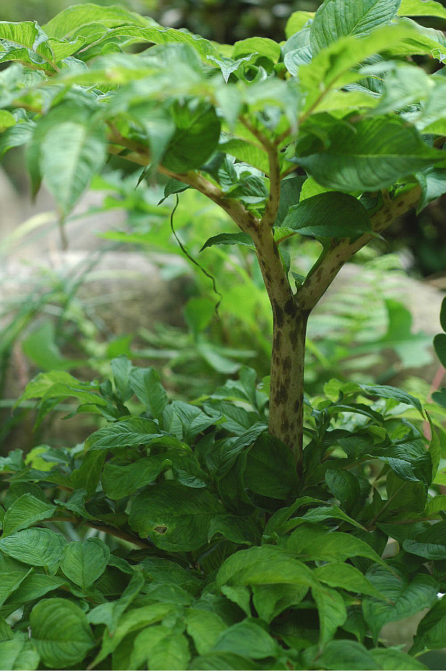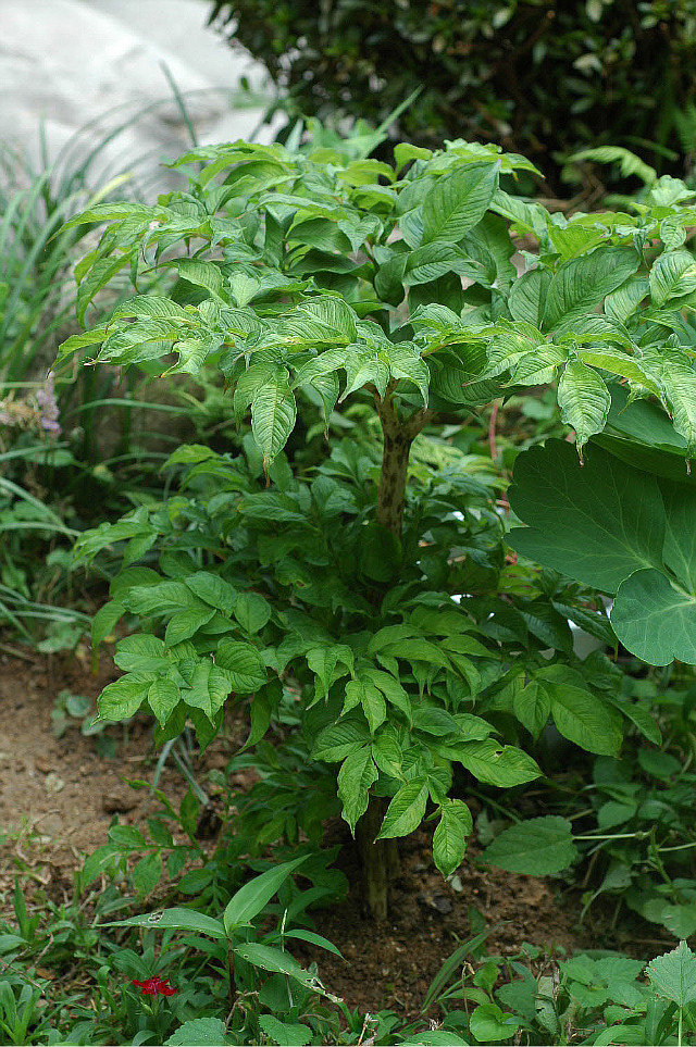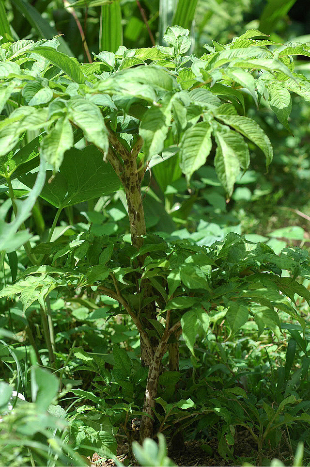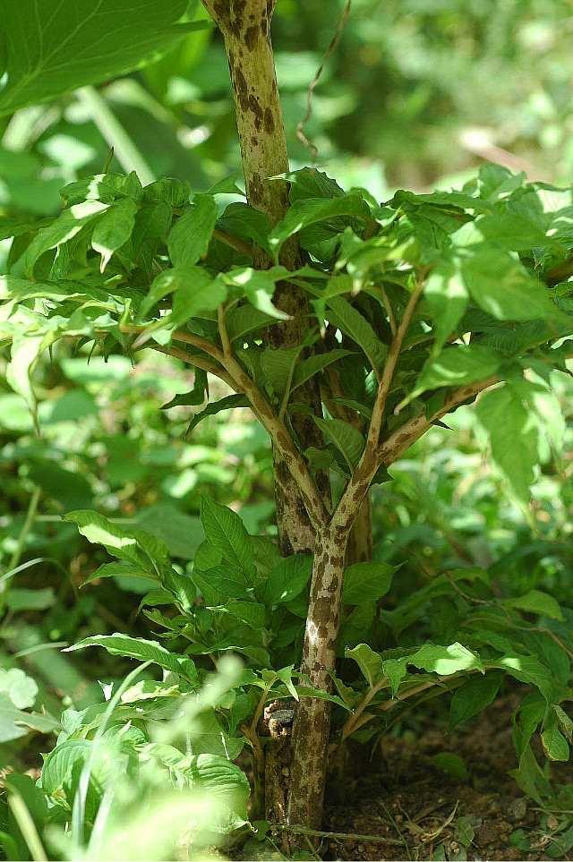 곤약이라고도 한다. 알줄기는 편평한 원형이고 그 가운데에서 잎이 나와 1m 정도까지 자란다. 잎은 3개로 완전히 갈라졌다가 다시 2∼3개로 갈라지며, 그 조각은 다시 깃꼴로 갈라진다. 잎자루는 원기둥 모양이고 연한 녹색인데 자줏빛 반점이 있다. 작은잎조각은 달걀 모양 바소꼴이며 끝이 꼬리처럼 뾰족하고 털이 없다.