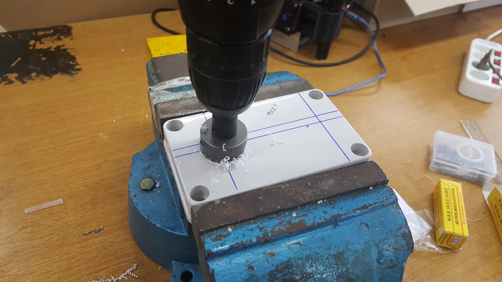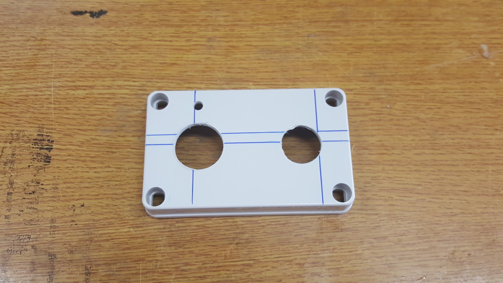 <그림6. 스위치 위치잡는 작업> <그림7. 홀캇타 드릴링> 오토캐드로 도면작성 후 출력해서 드릴 위치 잡고 홀컷터로 드릴링. 돌리는 타입 스위치 30파이 홀캇타 사용 푸쉬버튼 스위치 25파이 홀캇타 사용 <그림8. 홀캇타 드릴링 완료> <그림9. 스위치 장착> <그림10. 스위치 장착> 스위치 장착 완료 <그림11. 스위치 배선작업> 배선작업 수행