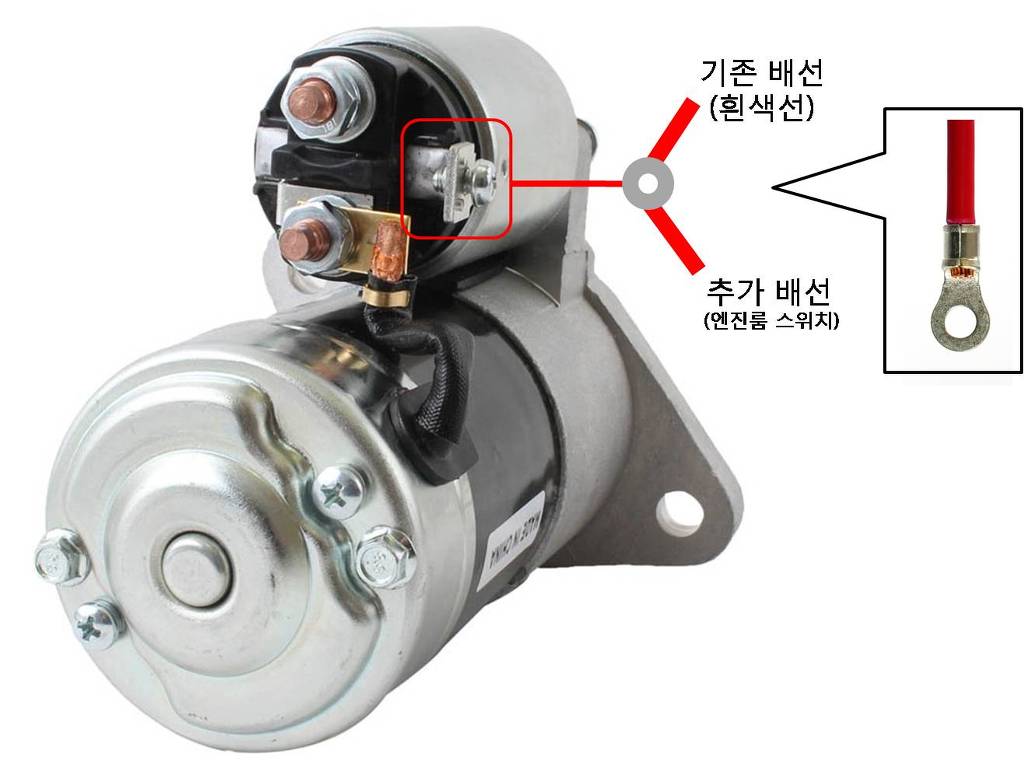 <그림4. 스타터모터 단자배선> 실제로 스타터모터를 보면 12v 굵은전선을 연결하는 단자와 시동버튼을 연결하는 솔레노이드 단자가 있다.
