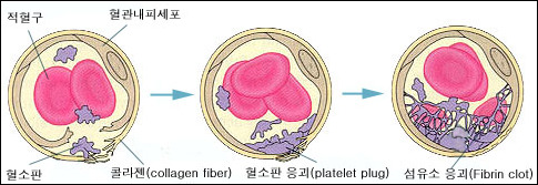 혈소판은 찢어진 혈관의 꺼칠 꺼칠한 표면에 닿으면 파열하여 몇가지 화학물질을 방출하는데, 이들 물질이 새어 나오는 혈액 속에 어떤 반응을 일으킨다. 이 반응의 정확한 과정은 아직 분명히는 모르지만, 반응의 결과는 알려져 있다. 그것은, 혈장 속의 피브리노겐이라는 단백질이 결정화 하여 그물 모양의 것으로 변하고 적혈구를 끌어 들여, 이에 의해 혈액의 누출구를 봉쇄한다는 것이다.