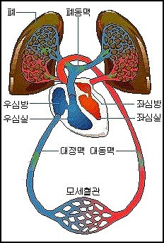 그 다음에는 다시 양쪽 폐로 통하고 있는 하나의 큰 동맥, 즉 폐동맥을 통해 심장 바깥으로 나간다. 그러면 폐가 혈액에 신선한 산소를 부여하여 선홍색과 활력 을 회복시켜 좌심방에 들여보내어, 다시 체내 여행을 되풀이 할 수 있도록 하는 것이다.