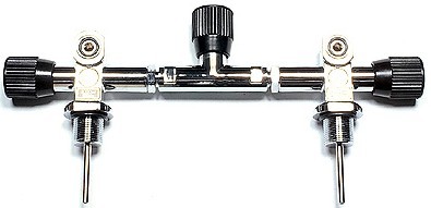 지금까지 말한 밸브들은 하나의 탱크에 결합하여 사용할 수 있는 것들이지만 매니폴드(manifold)는 2개의 탱크와 결합되며 역시 두개의 아웃랫이 있어서 2개의 레귤레이터를 결합시킬 수 있다. 매니폴드는 분해하여 싱글 탱크 용도로 전환시킬 수 있다. 또한 좌측과 우측 어느쪽이냐에 따라 나삿니 방향이 다르게 나온다.
