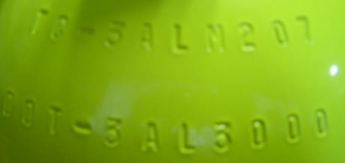검사 기관표시에 이어 탱크의 재질이 표시된다. “3AA”나 “3A”는 스틸합금을 표시하고 “3AL”은 알루미늄 합금을 뜻한다. 재질의 표시 다음에는 상용 압력을 나타내는 네자리수가 표시된다.보통은 1,800 PSI, 2,250PSI, 3,000PSI 가 많이 쓰이는데 어떤 것은 4,000PSI까지도 표시된것이 있다.
