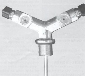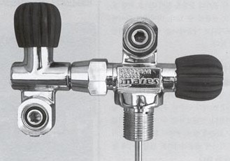 Y밸브는 두 개의 기체공급 구멍과 각기 별도의 개폐용 윙넛(wing nut)을 가지고 있어서 두 개의 호흡기 1단계를 따로따로 접속시킬 수 있다.