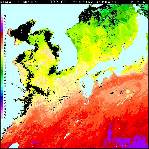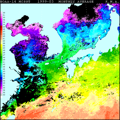 황해 중부에서 19℃, 동해 중부에서 15℃, 남해에서 13℃정도의 연교차가 난다.