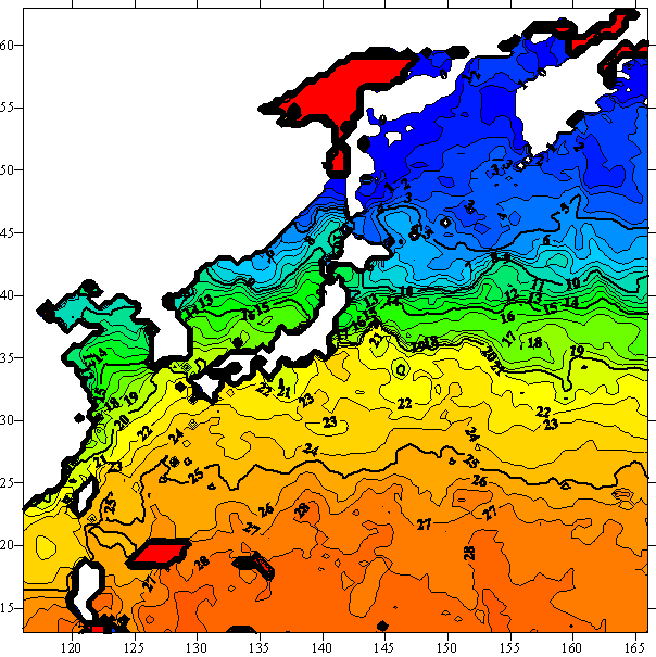 해수면이 받는 태양 복사 에너지는 태양의 고도가 높을수록 많아지며, 태양의 고도는 위도의 함수이므로 등온선은 위도에 나란하게 분포하지만 해안선 부근은 육지의 영향으로 등온선이 해안선에 나란하게 나타난다.