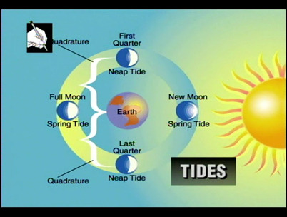 이 때 두가지 중요한 상황은 달, 지구, 태양이 일직선상에 놓이는 경우와 이 세 가지가 일직선상에 있지 않은 경우이다. 일직선상에 있을 경우는 그믐과 보름달 일 때로 달의 인력에 태양의 인력이 더해져 조석차가 가장 높은 사리(spring tide)가 된다.