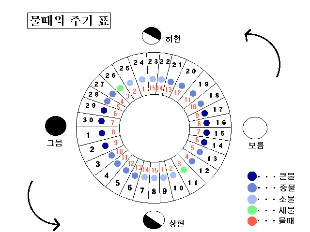 물때의 본래 뜻은 조류의 세기를 숫자로 등급화한 것으로 물때는 양력으로는 나타낼 수 없고 음력으로만 표현된다