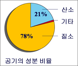 또한 여기에는 수증기와 미량의 불활성 기체(아르곤, 네온 등등), 이산화탄소와 오염, 엔진연소들에 의해 생긴 탄화수소가 포함되어있다. 일반적인 공기의 구성은 그림과 같다. 대부분의 다이빙시 공기에는 78%의 질소와 21%의 산소 및 1%의 다른기체가 포함된 것으로 간주한다.