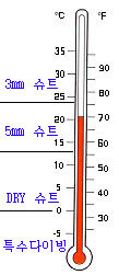 온도(Temperature)는 열에너지의 강도를 측정하는 방법이다. 다른 열에너지9온도가 같아질 때까지)계속된다. 이것은 언제나 체온보다 낮은 온도의 물에 있는 다이버에게는 열손실이 일어난다는 것을 뜻한다. 물은 공기보다 열용량이 2800배 정도 크고 가튼 온도에서 열 전도도가 약 25배(건조하고 안정된 공기일 때)정도 크다.