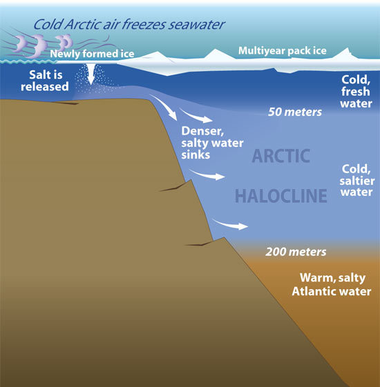 담수는 해수보다 더 가볍다. 그래서 만약 두 물이 섞이지 않는다면 담수가 위에 뜨게 될 것이다. (담수와 해수의 밀도차이는 녹아있는 염분량의 차이 때문에 발생하며 이런 현상은 강의 입구와 같은 자연계에 존재한다. 밀도가 다른 두 영역을 나누는 얇은 층을 염분약층(halocline)이라한다.