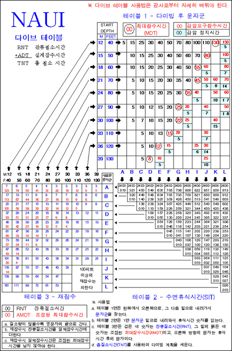 그리고 어느 수심에서의 압력을 어떻게 계산 하는 가에 대해서도 알아두는 것이 좋다. 해수에서는 1피트당 0.445 p.s.i.(0.03 bar)씩, 담수에서는 1피트당 0.432 p.s.i.(0.029 bar)씩 압력이 증가한다는 것을 알고 있으면 이 값을 피트 단위로 측정한 수심에 곱한 후, 그것에 14.7 p.s.i.(대기압의 평균값)를 더하 면 해수나 담수 어느 수심에서도 압력을 쉽게 계산할 수 있다.