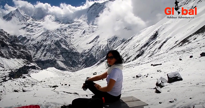 안나푸르나 히말라야 지역의 멋진 풍광을 감상한 안나푸르나 베이스캠프에 도착합니다. 이곳에서 산의 경치와 사진을 즐길 수 있는 30분의 시간이 주어집니다. 이곳은 눈 덮인 산의 360도 전경을 볼 수 있는 좋은 지점입니다.
