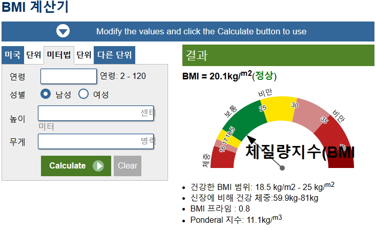 아래 사이트에서 나의 체질량 지수를 알아 보세요!