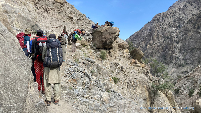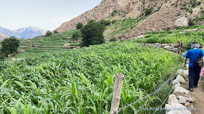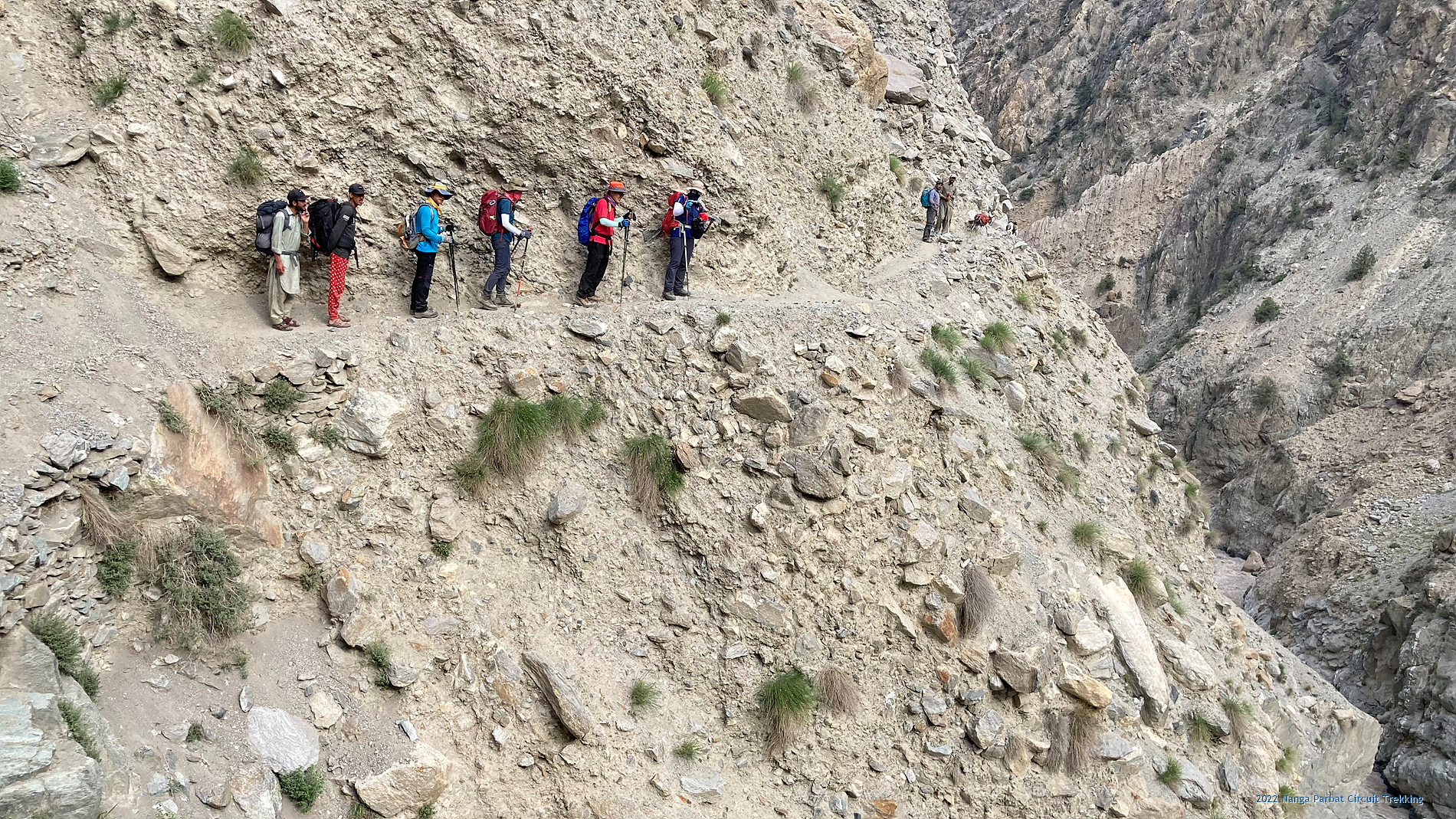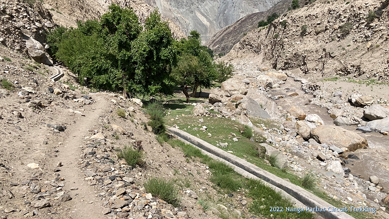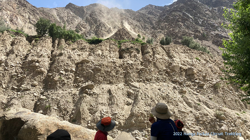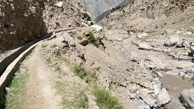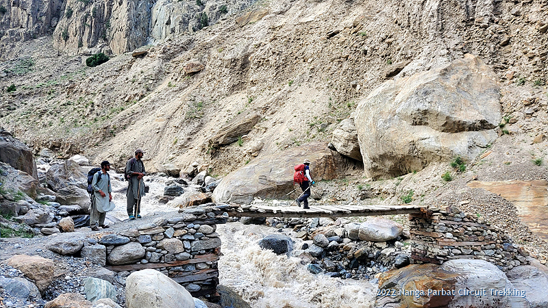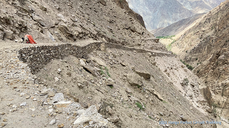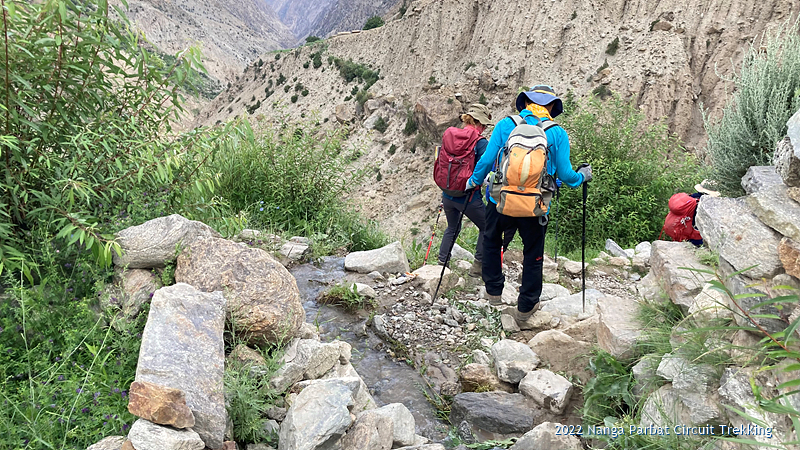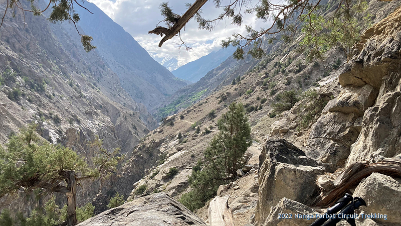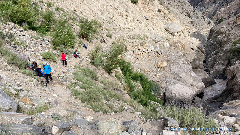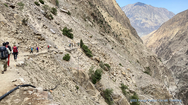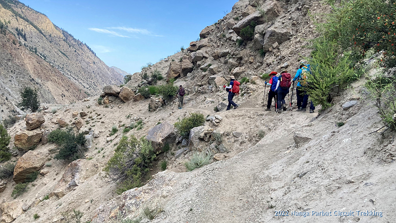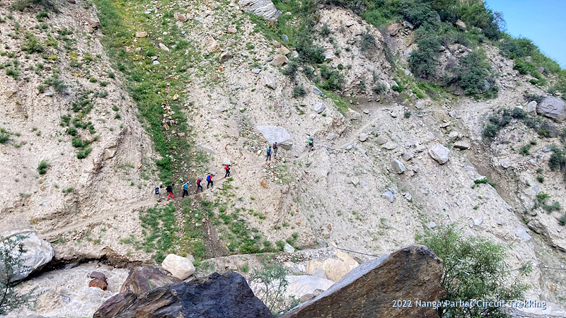 6시 35분 출발. 처음은 산비탈 오르막이다. 파키스탄은 파키스탄이다. 트레킹 마지막 날까지 긴장을 늦출 수 없다. 스틱을 하나만 짚고 가니 운행이 어색하다. 낭가 파르밧은 점점 멀어지고 있다. 1시간 운행하여 계곡 바닥으로 내려와 계류를 건넜다. 이제부터는 완편 산기슭을 타고 간다. 계곡 바닥은 다시 아래로 점점 멀어지고 있다.