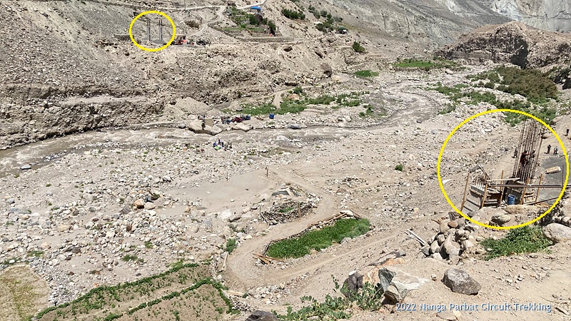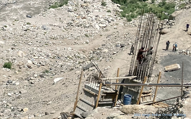 현재 딤로이 마을 앞 계곡에 장차 큰 다리를 놓을 계획으로 교대(다리 지지대)를 올리는 공사를 하고 있다. 두 사람이 매달려 철근을 고정하고 있는 모습을 보니 하세월이다. 그래도 시작을 했으니 언젠가는 완공되리라 생각한다. 계곡 바닥으로 내려가니 짐을 곤돌라에 실어 나르고 있다. 이어 우리들도 차례로 계곡을 건넜다.