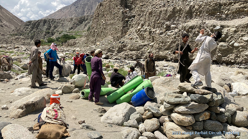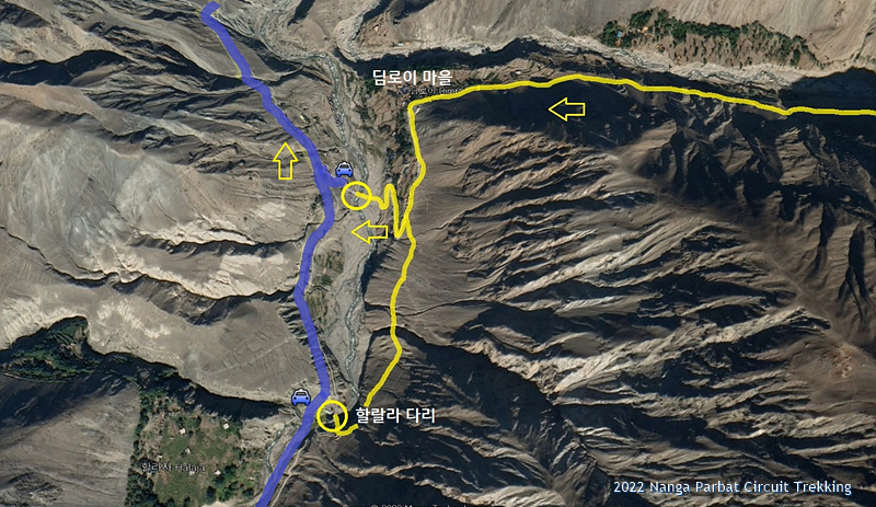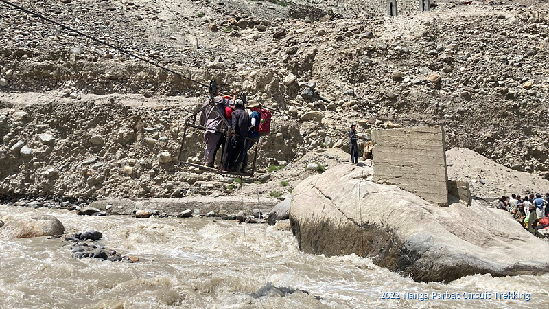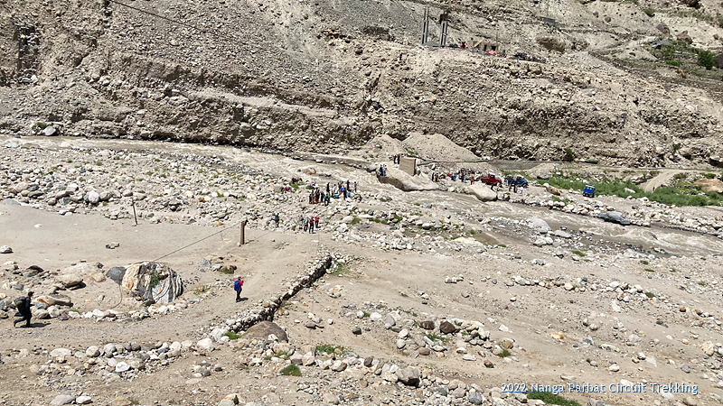 10시 50분, 딤로이(1600m) 마을에 도착했다. 이 마을에서 낭가 파르밧 원정대들의 카라반이 시작된다. 대부대가 이동하는 원정대들은 위쪽에 있는 할랄레이(Halaley) 다리를 건너지만 마을 사람들은 지름길로 마을 앞에 외줄 곤돌라를 만들어 다니고 있다. 2009년 7월 26일 KBS에서 방영한 <히말라야 14좌의 꿈, 고미영 낭가 파르밧에 잠들다>에서 고미영 대장이 할랄레이 다리를 소개하는 장면이 있다. 다른 원정대들의 영상에도 자주 보이는 다리다.
