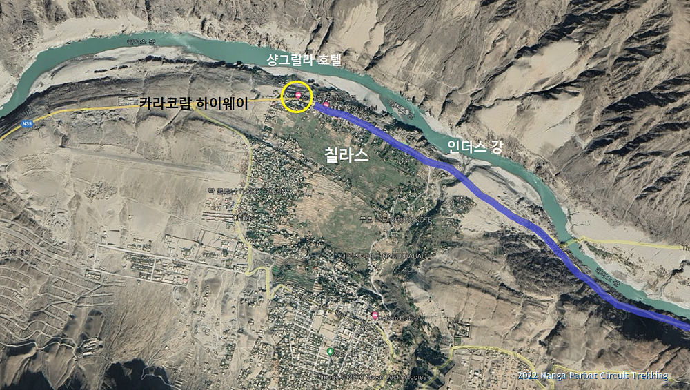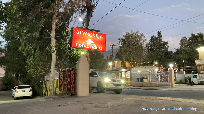 칠라스 숙소는 샹그릴라 호텔. 인더스강 바로 옆에 있는 원정대와 트레킹 들의 단골 숙소다. 샹그릴라 호텔(Shangri-La Hotels and Resorts)은 홍콩에 본사를 둔 호텔체인이다. 이 호텔은 아시아에 본거지를 두고 있는 중 최대규모의 고급호텔그룹이다. 1971년에 싱가포르에서 최초로 개업한 이래 현재는 전 세계에 65개의 호텔과 리조트, 객실 규모 27000개를 자랑한다고.