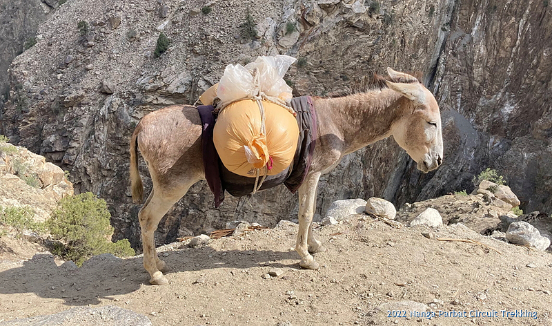 까마득한 계곡을 내려다 보며 걸었다. 이 길에 그늘이 있는 곳은 만나기 어렵기 때문에 그늘이 나오면 발길을 멈추고 땀을 식힌다. 쉴 때 사탕과 물은 필수다. 아래에서 당나귀에 짐을 싣고 올라오던 주민 두 사람이 우리가 쉬는 곳에 오자 멈추고 쉰다. 오르막이니 더 힘들 것이다. 사탕 하나씩 배급. 그들이 보조 가이드 아쉬라프와 이야기를 나누는 사이 당나귀들은 조용히 명상에 잠겨 있다.