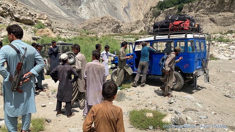 카라코람 하이웨이는 아직 완공되지 않았지만 차량 통행은 가능해서 라왈핀디에서 3일이면 디아미르 베이스캠프까지 갈 수 있다. 그런데 공사를 맡은 중국측이 정치적인 이유를 들어 외국인의 통행을 금지시켜 차량을 이용할 수 없었다. 메스너는 식량을 구입하여 포터 6명을 고용해 카간 계곡을 출발하여 나란을 거쳐 바부사르 고개를 넘고 디아미르 베이스캠프까지 트레킹을 해야 했다.