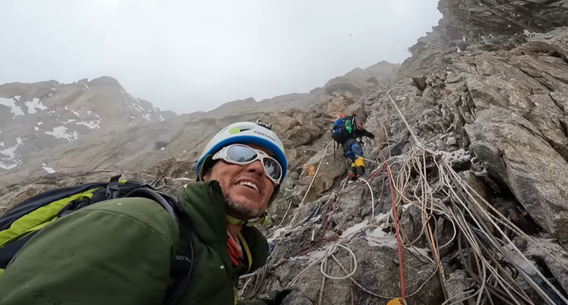 킨스호퍼 루트를 오르는 2022년 아르헨티나 원정대. 원정대들이 설치한 고정로프가 많다.
