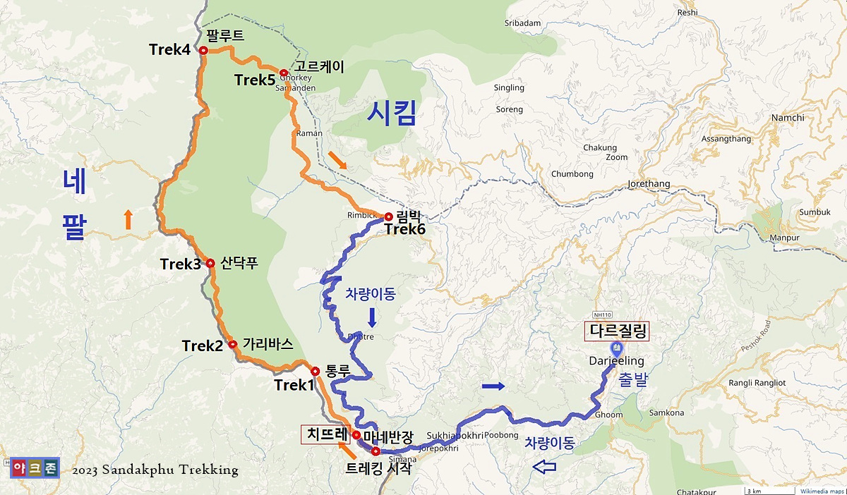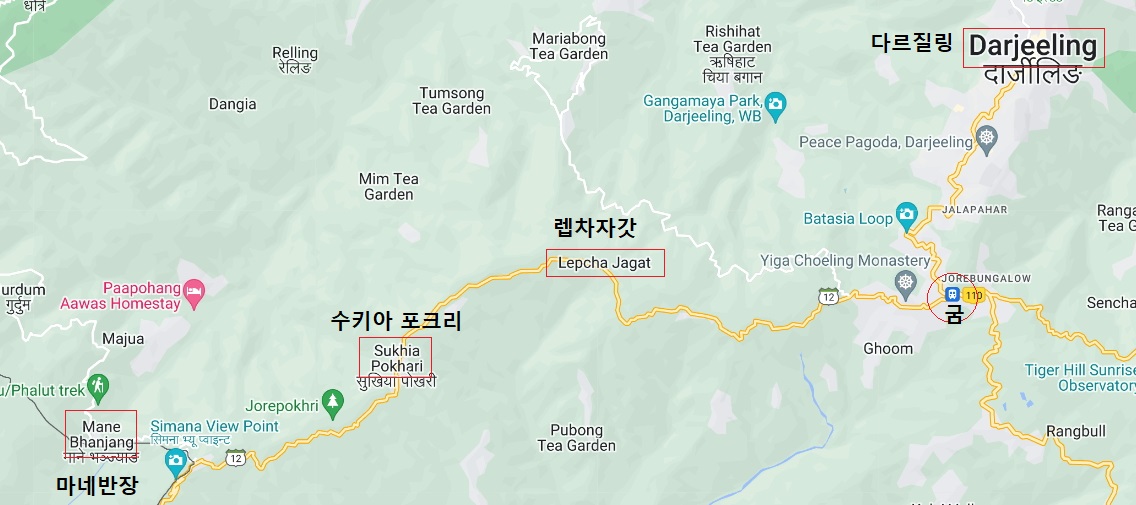 마네반장에서 다르질링까지는 23km. 렙차자갓과 수키아 포크리는 다르질링에서 가까워 쉽게 올 수 있다.