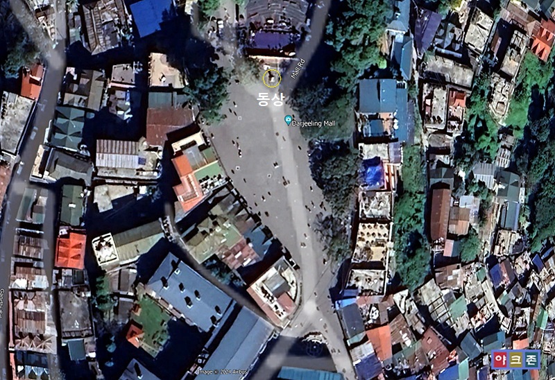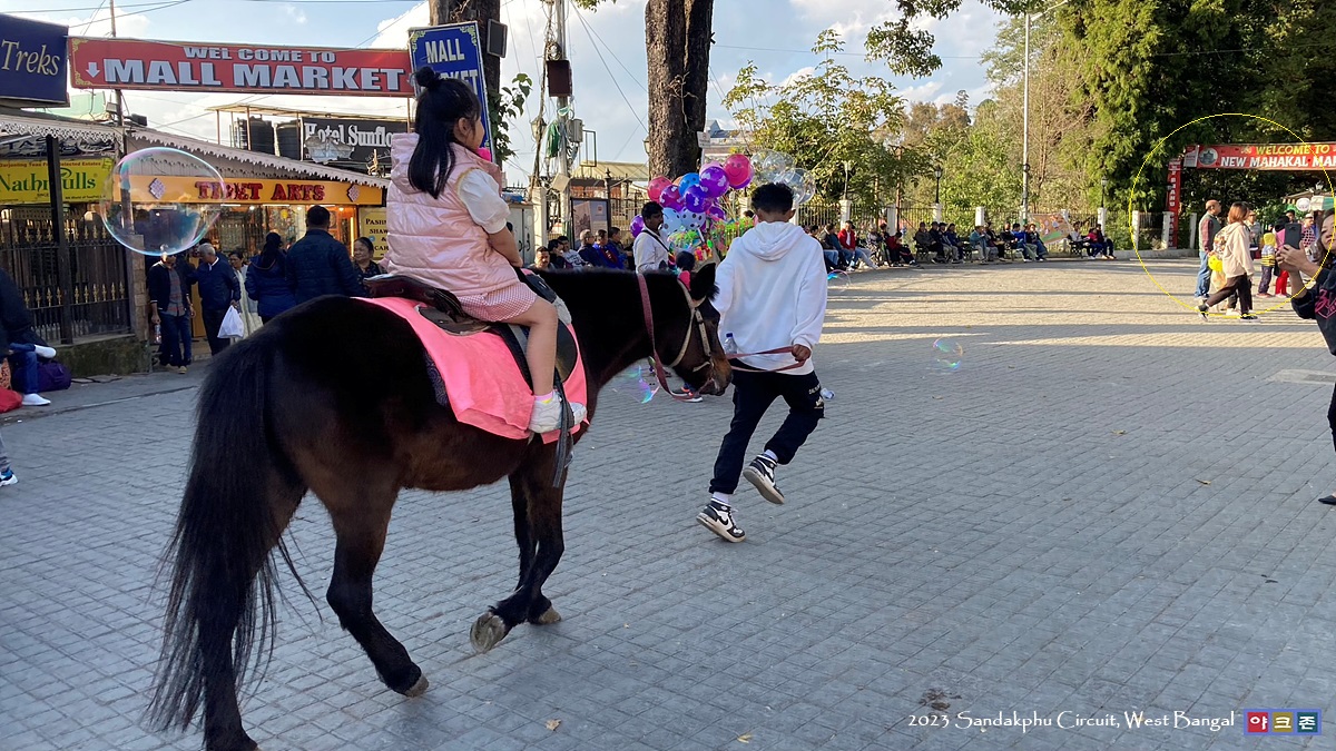 다르질링 명물인 홍차 몇 통 사서 호텔로 가기 위해 다시 광장으로 올라왔다. 우리 호텔은 항상 광장을 지나간다(노란 원쪽). 한 어린이가 말 타고 광장을 한 바퀴 돌고 있다.