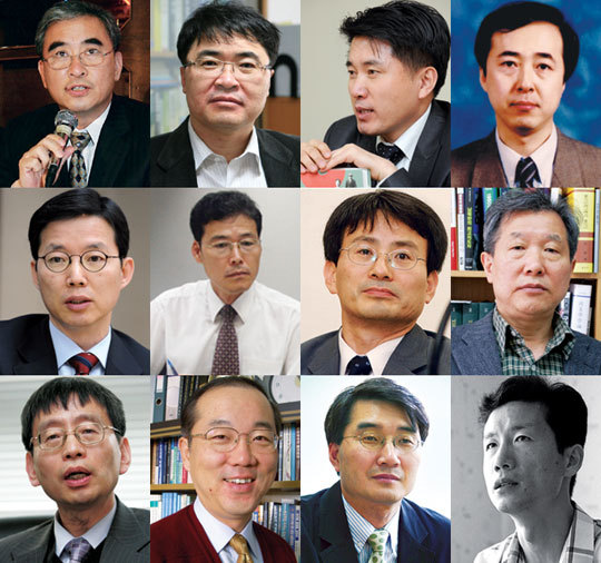 (위 왼쪽부터)이영훈 서울대 경제학과 교수·김재호 전남대 경제학부 교수·주익종 낙성대경제연구소 연구위원·김용직 성신여대 정치외교학과 교수 (가운데 왼쪽부터)김일영 성균관대 정치외교학과 교수·김영호 성신여대 정치외교학과 교수·김광동 나라정책연구원 원장·김세중 연세대 국제관계학과 교수 (아래 왼쪽부터)박효종 서울대 윤리교육과 교수·김종석 홍익대 경영학과 교수·전상인 서울대 환경대학원 교수·김영환 시대정신 편집위원