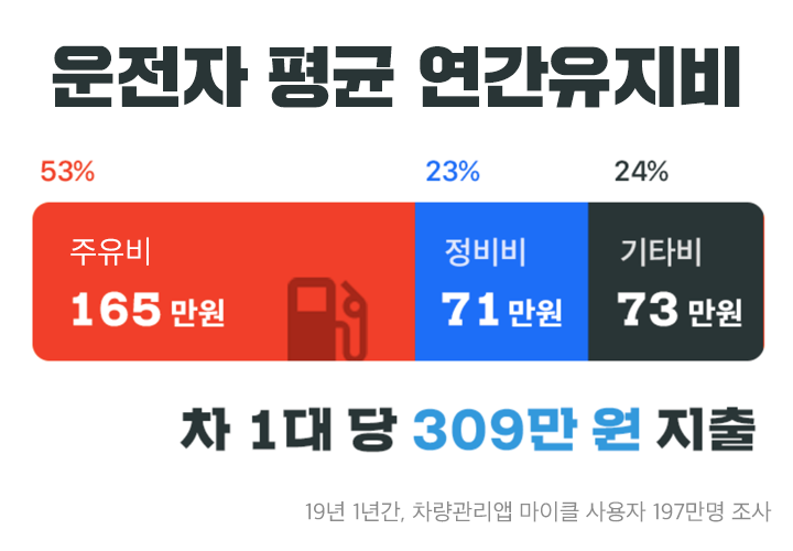 오늘은 이 차량유지비를 관리하는 법을 알려드릴까 합니다. 차량유지비는 어떻게 이루어져 있을까? 차량유지비는 차로 인해 발생하는 모든 비용을 포함하는데요. 크게 주유비와 정비비, 기타비용으로 나누어집니다. 차량관리앱 마이클을 통해 차를 관리하는 운전자의 유지비를 분석한 결과, 차 1대 당 연간 평균 309만원의 유지비가 발생하는 것으로 나왔습니다. (차종에 따라 유지비가 다를 수 있습니다.)