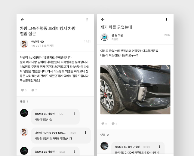 정비는 분류도 다양하고 정비소마다 가격이 다르기 때문에 비용을 예측하기 힘듭니다. 이럴 때일수록 필요한 정보를 충분히 습득하는 게 중요한데요. 출처차량관리앱 마이클 질문게시판 우선 정비소에 방문하기 전 내 차에 어떤 결함이 생긴 건지, 다른 사람은 어떻게 수리받았는지 궁금하다면 운전자 커뮤니티에 질문해보세요.