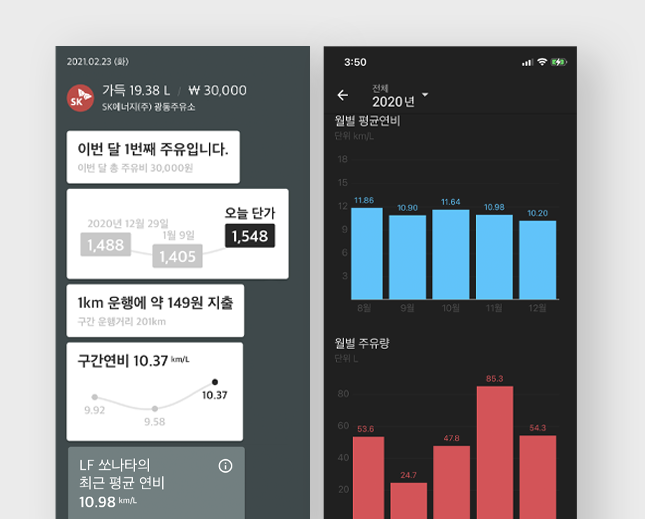 또한 주유할 때마다 내 차의 구간 연비와 내 차종 평균 연비를 알려줘 더 섬세한 연비관리가 가능하죠. 한 번에 큰 지출을 요하는 정비비는 어떻게 아낄 수 있을까? 그렇다면 한 번에 큰 지출이 필요한 정비비는 어떻게 아낄 수 있을까요?