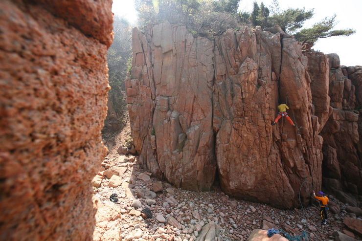 주객이 전도된 마음을 가라앉히고 급경사 지대를 내려서자 예쁜 몽돌해변 위로 화강암 직벽이 나타났다. “여기가 제1구역, 애스트로맨 암장입니다. 난이도는 5.9~5.11이며 총 23개의 루트가 있습니다. 이곳부터 등반합시다.”