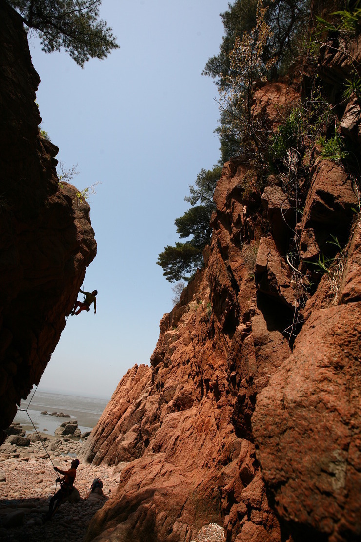 장비를 차는 사이에 물은 빠른 속도로 빠지고 있었다. 몽돌밭 뒤로 너른 개흙이 드러날 때쯤 윤씨가 5.9급인 ‘짱구박사’ 등반을 시작했다. 보기에는 막막한 직벽 같은 루트였지만 숨은 홀드들이 곳곳에 있었다. 세번째 볼트를 지난 윤씨가 발을 벌려 스테밍 자세를 취한 후 머리 위에 있는 큼지막한 홀드를 잡고 일어서자 쌍볼트가 반겼다.