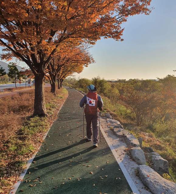 오후의 낙동강 보도(步道)에서 가끔 산책하는 사람을 만난다. 가벼운 마음으로 반갑게 인사를 건넨다. 그런데 배낭에 태극기를 꽂고 자못 진중하게 걷는 내 모습이 남달랐는지 ‘어디서 오느냐?’ 묻는 분이 있어 낙동강 종주 이야기 했다. 저 강원도 태백에서 1300리를 혼자서 걸어온 여정을 말해 주면서. 이제 최종 목적지인 부산 낙동강하구둑까지 얼마 남지 않았다고 감격어린 어조로 말했다. 여기 엄궁동에 산다는 그 분은 내 이야기를 듣고 나서 경이로운 시선으로 바라보면서 격려해주는 것이었다. “아, 참 대단하십니다!” — 사진 한 컷을 부탁했더니 흔쾌히 찍어주었다. 그래서 낙동강 종주 최종 구간의 인증샷을 얻게 되었다. 태극기를 배낭에 꽂고 혼자서 걸어가는 뒷모습을 찍어달라고 했다.