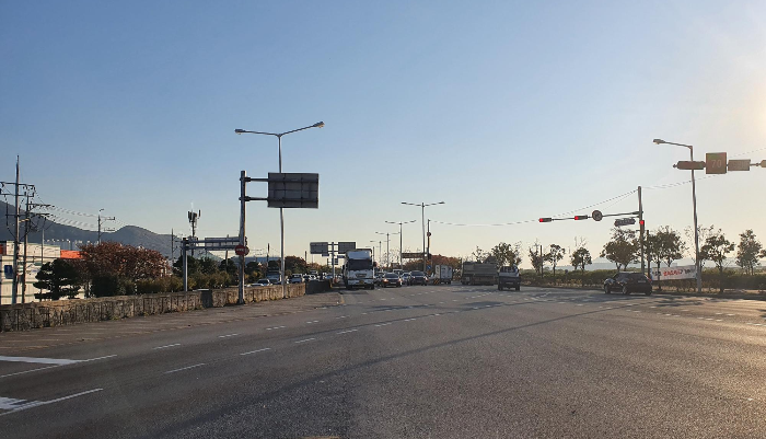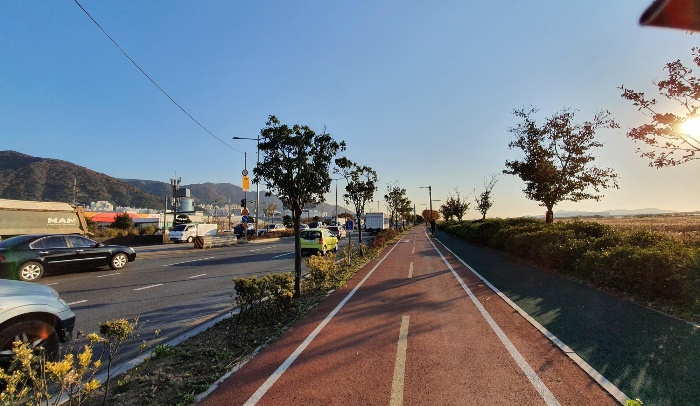 오후 4시 13분, 여기 ‘감전교차로’에는, 우측의 강안을 따라 내려오는 강변도로가 제방 길 좌측으로 넘어와 남쪽 다대포로 이어진다. 그러므로 내가 걷는 제방 길은 우측의 강변도로 횡단보도를 건너 낙동강 강안으로 접어들게 된다. 그래서 제방의 길(바이크로드)은 폭이 넓은 강변도로 횡단보도를 건너야 한다. 그리고 지금까지 제방의 좌측에서 나란히 내려온 낙동대로는 여기 감전교차로에서 남동쪽으로 방향을 바꾸어 엄궁동교차로 쪽으로 갈라져 나간다.