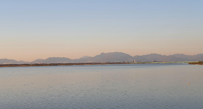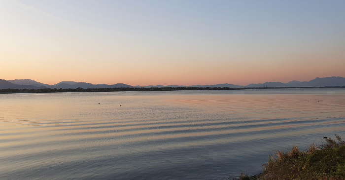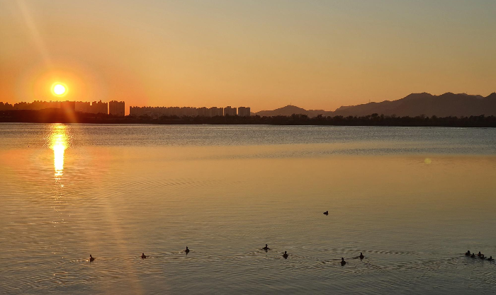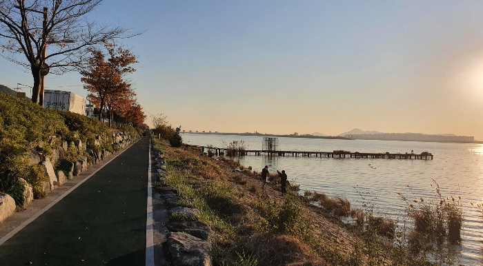 오후 5시, 전망대 위에서 바라본 낙동강은, 금빛 저녁노을이 내린 거대한 호수(湖水)였다. 전망대 바로 앞에 낙동강 수면 위에 옹기종기 모여 있는 물오리떼가 정겹다. 해가 많이 기울어 강 건너 서쪽의 아파트 위에 내려앉고 있다. 석양을 받은 강물은 온통 금빛으로 물들었다. 낙동강 하구 낙조는 장관이었다. 전망대를 내려와 걷는 사이, 이 대장에게서 전화가 왔다. 지금 낙동대로 삼락생태공원 앞이라고 했다. 서로 이야기를 나누면서, 만나는 장소를 정했다. 하구둑 입구의 도로변에 서 있겠다고 했다.