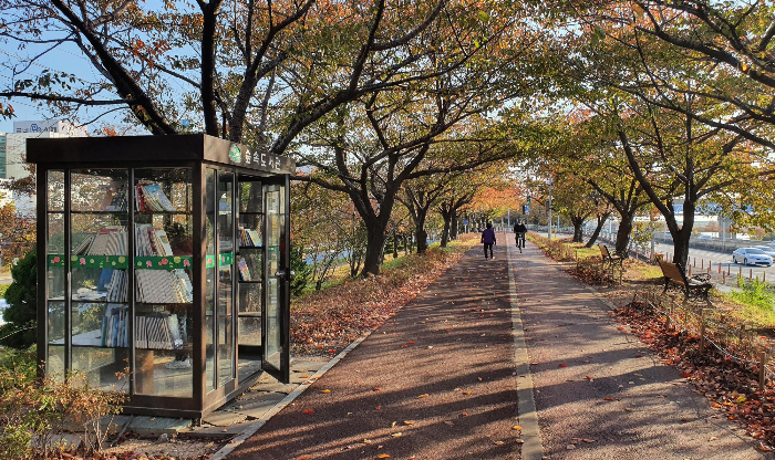 제방의 바이크로드는 직선으로 뻗어있다. 길가에 아담한 철제 박스건물이 있다. ‘숲속도서관’이라고 써 놓았다. 박스 건물 안에는 여러 권의 책이 서가에 꽂혀 있다. 산책 나온 시민들이 이용할 수 있도록 책들을 구비해 놓은 것이다. 사상구 문화관광과에서 관리하는 특별한 콘텐츠 구조물인데 얼마나 많은 사람들이 이용하는지 모르겠지만, ‘책이 있는 산책길’, 신선한 발상이다.