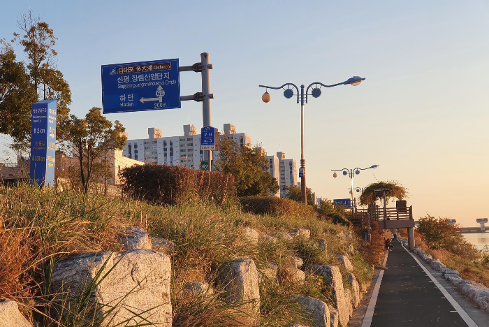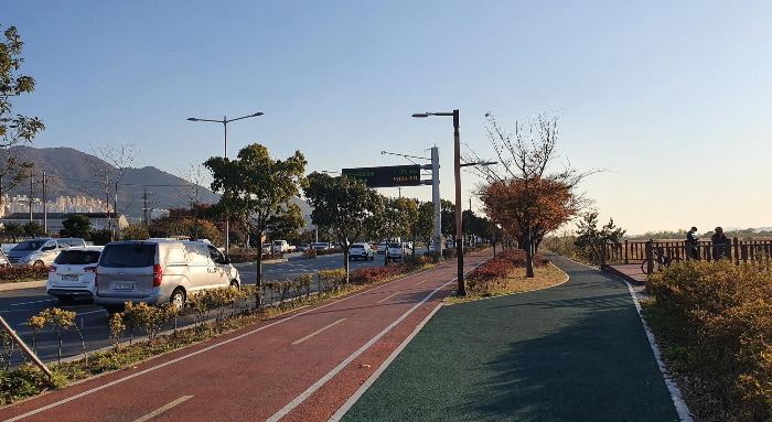이제, 제방 길의 우측 낙동강 쪽은 도로가 없어 자동차 왕래가 없다. 제방 아래 샛강 너머 엄궁습지에는 곳곳에 웅덩이와 누렇게 가을 색으로 변한 갈대와 수초들이 가까이 다가와 있다. 습지 가장자리의 나무 위에 기울어진 가을해가 맑은 햇살을 뿌리고 있다. 길의 높이가 같은 좌측의 강변도로와 자전거 길이 나란히 이어지고 있다. 낙동강을 따라가는 강변대로는 왕복 8차로의 간선도로이다. 북구의 구포에서 사상구의 삼락생태공원의 강안을 따라 이어져 온 이 도로는 감전동교차로에서 제방 길과 위치를 바꾸어, 낙동강하구둑이 있는 사하구 하단동에 이어 신평동—장림동—다대포까지 이어진다.