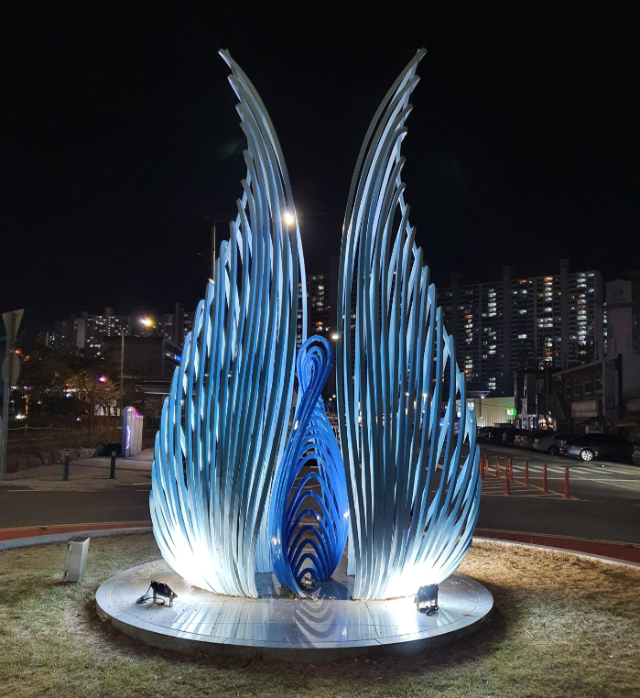 그리고 ‘沒雲臺 / 몰운대’ 비(碑)가 있는 다대포해변공원 광장으로 나와 산책하면서 서로 담소를 나누었다. 공원의 한 가운데 원형의 너른 광장이 있고, 거기에는 우아한 날개를 하늘로 치켜 올린 백조를 형상화한 조형물이 있다. 백조는 갖가지 색의 조명을 받아 현란하게 변신하고 있었다.