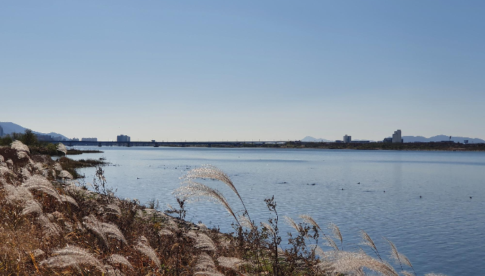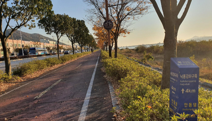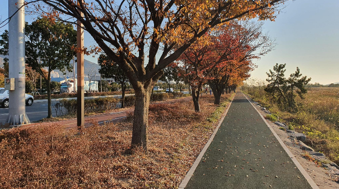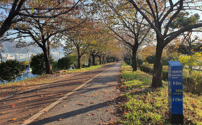 오후 4시 18분, 좌측의 바이크로드와 보도 사이에 이정표가 있다. ‘↑낙동강하구둑 5km’를 표시하고 있다. 보도의 좌측에 즐비하게 서 있는 활엽수 나뭇잎이 누렇게 가을 색으로 물들어 있고 보도에는 떨어진 나뭇잎이 여기저기에 흩어져 있다. 우측은 엄궁의 습지이다. 좌우를 살펴도 계속 같은 풍경이 이어진다. 가을 햇살이 내리는 강안의 길을 혼자서 걷는다. 이런 저런 상념들을 비워버린 마음은, 나름 순정한 상태가 되어 있다. 특히 저 맑은 하늘 아래 충만한 기운이 온몸을 채우고 있는 느낌이다.