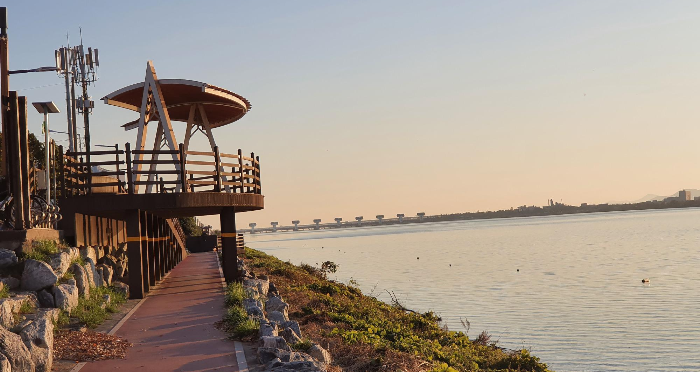 전망대에서 조금 내려오니, 엄궁동에서 낙동강에 유입되는 학장천의 테크다리가 있다. 강변도로 건너편에는 ‘엄궁농산물도매시장’의 우뚝한 조형탑이 보인다. 이제 하구둑까지는 3km를 앞두고 있다. 고요한 낙동강 강물위에는 일군(一群)의 오리떼가 유유히 떠가고 있는 모습도 보인다. 이제 저 아래쪽 낙동강을 가로지르는 하구둑 주탑의 행렬이 더욱 선명하게 보인다. 조금 내려오니 ‘하구둑 2km’라고 쓴 이정표를 지나자, 강안의 보도 위에 전망대가 있다. 보도 가장자리에 원주(圓柱)의 콘크리트 기둥을 세우고 그 위에 네모난 테크마루를 깔았는데, 도로 쪽 가장자리에 기둥을 즐비하게 세우고 그 위에 상판을 만든 뒤 등나무 넝쿨을 올렸다.