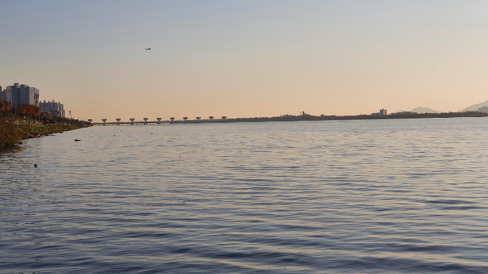 엄궁항을 지나고 나니 가을해가 강서구의 하늘에서 내려앉고 있었다. 아, 드디어 오늘 하루해가 저물고 있는 것이다. 호수처럼 고인 검푸른 낙동강 물결이 부드럽게 일렁인다. 저만큼 낙동강하구둑의 주탑 구조물이 더우 가깝게 다가오고, 그 위로 아득히 비행기 한 대가 떠 온다. 바다를 건너온 비행기가 김해국제공항에 착륙하기 위해 서서히 고도를 낮추어 가고 있는 것이다.
