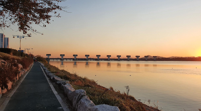 오후 5시 15분, 해가 넘어갔다. 서둘러 걸음을 재촉했다. 다리가 무겁고 하체에는 은근히 통증이 있었지만 목적지를 눈앞에 둔 마음은 경쾌했다. 즐비한 하구둑 주탑이 만드는 스카이라인을 바라보며 낙동강의 금빛 노을에 젖어서 걸었다. 하늘이 내린 축복처럼, 아름다운 낙동강의 황홀경이다.