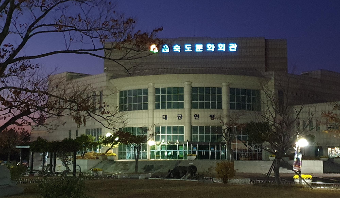 사하구 하단1동인 을숙도엔 생태공원과 철새공원이 있고, 큰 길이 나고 아파트가 들어서고, 낙동강하구에코센터, 을숙도문화회관 등이 자리 잡고 있다. 부산의 현대미술관도 이곳에 있다. 밤이 되었으니 본격적인 을숙도 탐방은, 내일 밝은 나로 미룰 수밖에 없다. 그러나 우리 동지들을 태운 이상배 대장의 카니발은 을숙도로 들어갔다. 을숙도문화회관으로 들어가 주차장에 차를 세웠다. 그리고 편안한 마음으로 함께 산책을 했다. 오늘 약 30km를 걸어왔지만 배낭을 벗어놓고 걷는 발걸음은 날아갈 듯 가벼웠다. 우리가 다시 만나게 된 유쾌함을 함께 나누면서 경내를 걸었다.