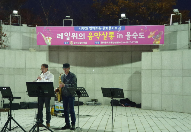 어디선가 밤하늘의 정적을 뚫고 악기의 연주소리가 들려왔다. 을숙도 문화회관 안쪽의 조각 공원 광장, 관중도 없는 야외무대에서 두 사람이 색소폰 연주를 하고 있었다. 플랜카드를 바라보니, ‘한마음색소폰앙상블’이 주최하는 「시민과 함께 하는 문화콘서트—레일 위의 음악살롱 in 을숙도」라고 걸어놓았다. 색소폰동호인들의 연습 삼아 연주하는 작은 음악회였다. 비록 단출한 두 사람이지만, 어쩌면 나의 낙동강 종주 대장정을 축하해 주는 음악회라는 생각이 들었다. 어두운 밤하늘에 울려 퍼지는 감미로운 색소폰 선율, 우리는 걸음을 멈추고 그들의 연주 음악을 감상했다.