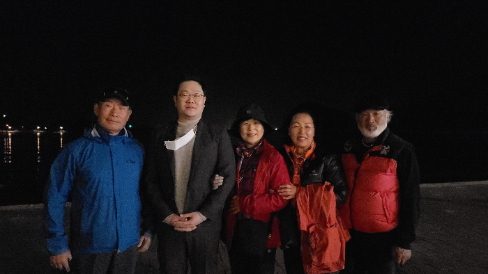 사위(四圍)에 어둠이 내리기 시작했다. 모든 가로등이 불빛을 밝힌다. 오후 6시가 가까워서야 기원섭의 카니발이 도착했다. 낙동강 태백산 출발 동지인 이상배 대장, 이진애·김옥련 대원이 차에서 뛰어내려서 나를 반갑게 맞아주었다. 태백의 출발(出發)처럼 낙동강 1300리 종주 대장정의 도착지(到着地)에서 우리는 다시 만났다. 출발할 때의 설레는 마음처럼 을숙도 앞에서의 만남은 말할 수 없는 감동(感動)이었다. 대원들은 따뜻한 축하와 정성어린 격려를 해 주었다. 오직 고맙고 감사할 따름이다.