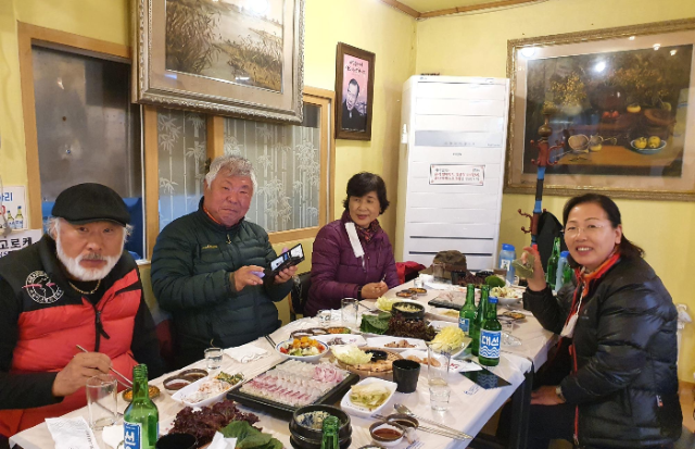 버드나무집 사장 ‘서효상’ 님은 독실한 가톨릭신자이다. 주방에 있는 사장님을 청하여 인사를 나누었다, 나는 스테파노이고 그는 바오로였다. 낙동강 대장정의 성공을 간단히 이야기하고, 오늘 특별히 푸짐하고 싱싱한 회로 식탁을 차려달라고 주문했다. 사장님이 신자(信者)이니 더욱 미덥고 반가웠다. 사장이 주방에서 직접 회를 뜨고 도우미가 이런저런 음식을 내왔다. 식탁에는 금방 전복, 멍게, 해삼, 낙지 등 신선한 해산물을 비롯하여 미역국에 살짝 삶은 문어, 새우 온갖 반찬들이 상을 채웠다. 얼마 후에 사장님의 정성 어린 손길로 빚은 회가 나왔다. 여러 가지 종류의 자연산 바다회는 싱싱하고 푸짐했다. 각자 잔에 맑은 이슬을 채우고 나서, 좌장의 기원섭이 낙동강 종주를 축하하는 따뜻한 건배사를 했다. 그리고 그간에 마음에 담았던 이러저런 이야기를 나누며 유쾌한 시간을 보냈다.